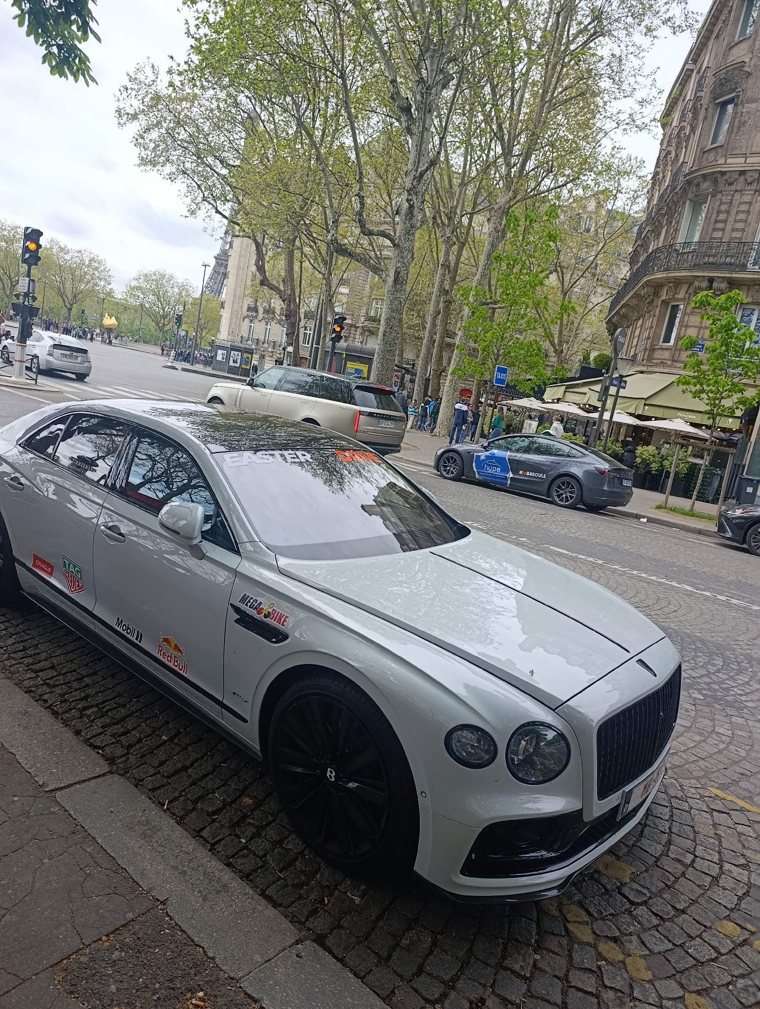 white Bentley sedan parked on a cobblestone street in Paris, France. The car is decorated with racing stickers like Red Bull and Mobil 1. In the background, there's the Eiffel Tower, traffic lights, and buildings typical of Parisian architecture. Other vehicles and pedestrians are present, along with trees lining the street and a cafe with outdoor seating.