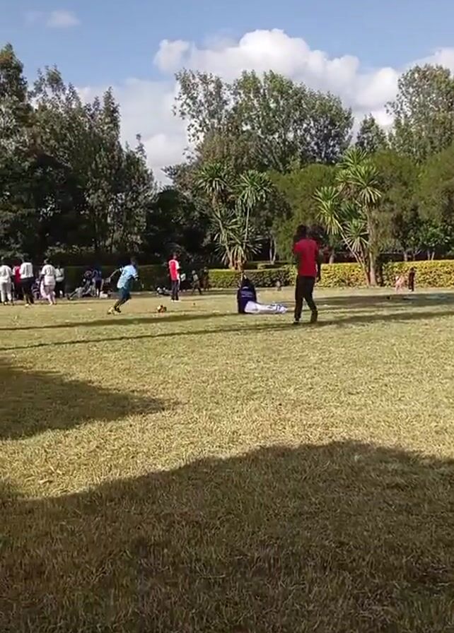 A group of people are playing soccer on a grassy field on a sunny day. There are trees and a hedge in the background. Some people are running, some are lying on the ground, and one person is wearing a red shirt with the number 7 on the back. The camera appears to be handheld and is partially obscured by a white shoe.