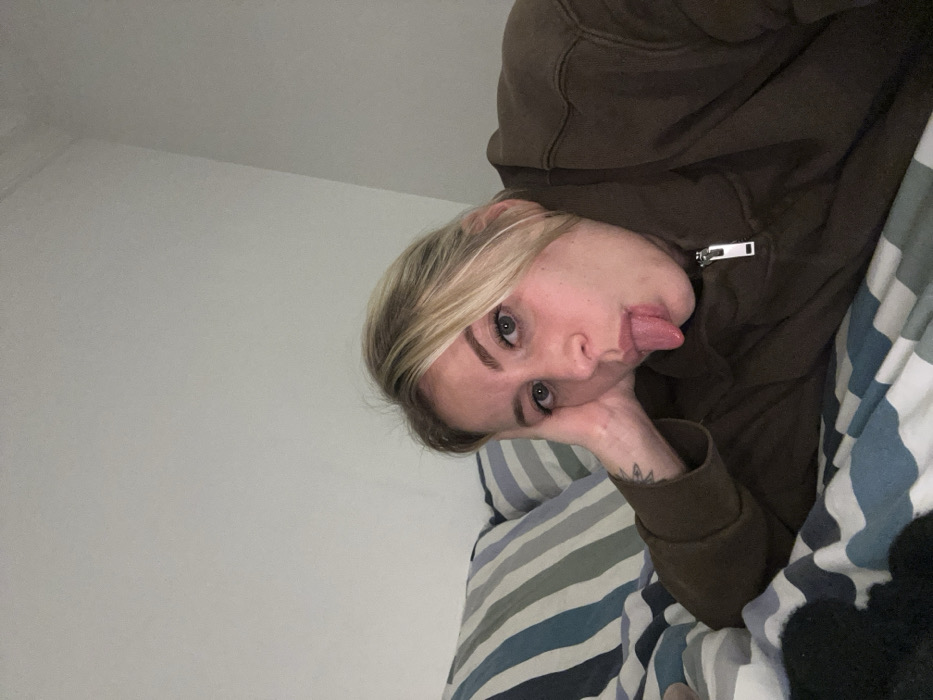 A young woman with blonde hair lies on a striped bedspread, her head resting on her hand. She wears a brown hoodie and sticks her tongue out, looking directly at the camera. A tattoo is visible on her wrist. The background consists of a plain, light-colored wall and ceiling. The image is taken at an angle, with the subject appearing sideways.