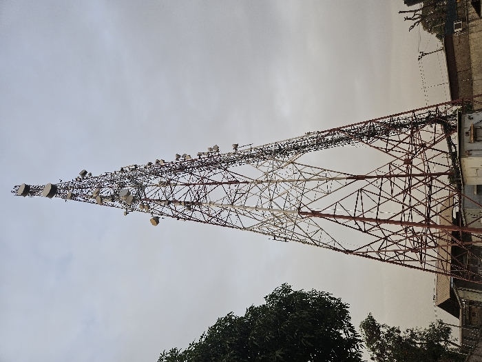 - "A tall, red and white communications tower dominates the frame, extending upwards towards a gray, overcast sky" by FM-wD7Od2, licensed under CC BY 4.0
