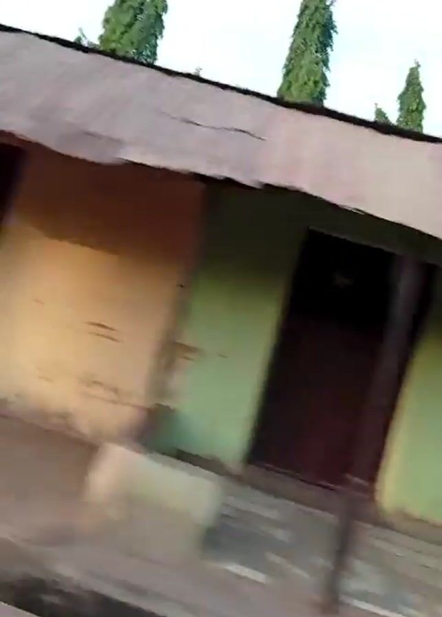 fast-moving view from a vehicle driving down a street. The video is shaky and blurred. Buildings with corrugated metal roofs and varied colors can be seen on both sides of the street. Some buildings have barred windows or open doors. There are also some trees visible. The video ends showing a building painted blue with orange circles and red doors.