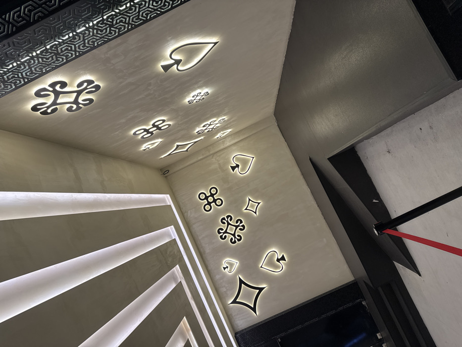 An interior view depicts a modern commercial space, specifically identified as the Palm Beach Club & Casino in Sofia, Bulgaria. The scene features light beige-grey walls and ceiling, contrasting with dark grey and black floor sections. The ceiling is adorned with multiple parallel recessed linear LED light strips emitting a cool white glow. The walls are decorated with numerous illuminated back-lit cutouts, comprising both standard playing card suits (spades, hearts, diamonds, clubs) and several West African Adinkra symbols, arranged in a scattered pattern. A decorative black metal panel with a repeating geometric hexagonal pattern is visible along the upper right wall/ceiling junction. The floor includes steps or changes in elevation, with a visible black stanchion pole and a taut red stanchion rope extending from the lower left towards the center. No individuals are present in the image.