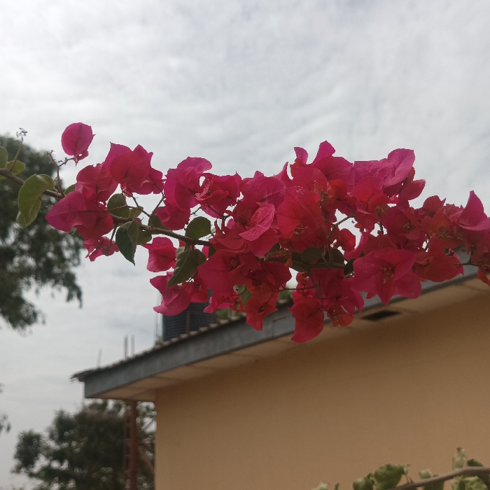 A close-up, high-angle shot depicts a branch of bright fuchsia bougainvillea flowers with green leaves extending from the upper left to the right. Below the flowers, a portion of a light tan-colored building is visible, featuring a grey roof with an overhang and a black cylindrical water tank situated on the roofline towards the left. In the background, out-of-focus green tree foliage is present to the left of the building. The sky is overcast with white and light grey clouds exhibiting some wispy formations. This scene is located in Rafin Par, Nigeria. No individuals are present.