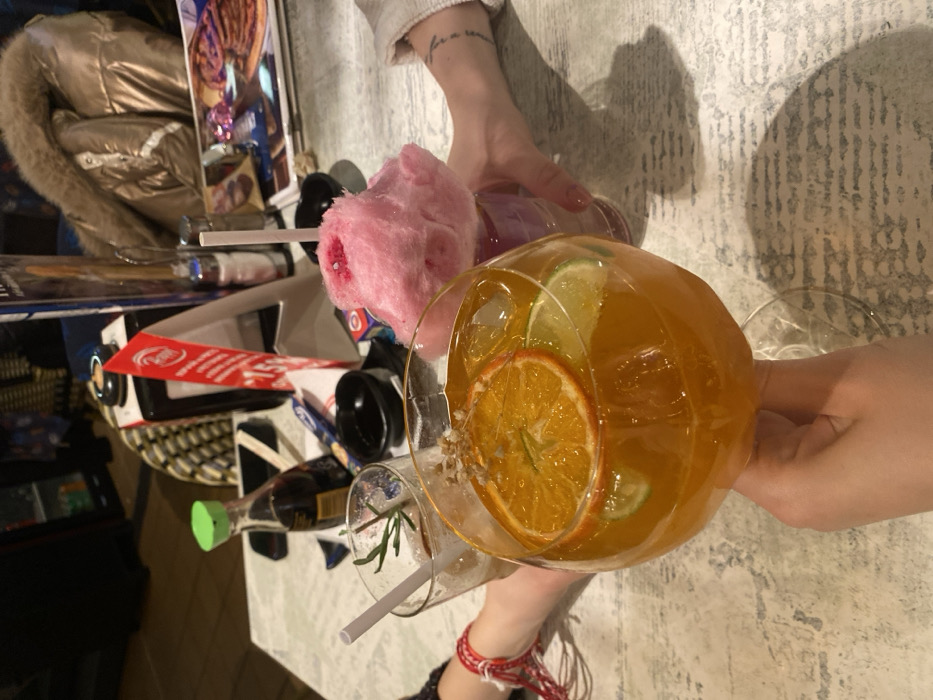 The image depicts an indoor scene within a restaurant, most likely a Wok to Walk establishment located in Varna, Bulgaria, indicated by a prominent red table stand bearing the text "Wok." The perspective is a close-up, downward view of a table where at least three individuals are present. In the foreground, a light-skinned hand, presumably female, holds a large stem glass filled with an amber-colored liquid, ice cubes, two visible orange slices, two lime wedges, and a scattering of small, granular toppings on the surface. To the immediate left, a wrist adorned with a red and white braided bracelet is visible, belonging to the same person or an adjacent individual. Towards the middle ground on the right, another light-skinned hand, also presumably female, holds a purple-tinted glass. This glass is topped with a large, fluffy mass of pink cotton candy, from which a white straw protrudes. A faint tattoo consisting of Japanese text is visible on the inner forearm of this individual. To the left, a third hand holds a clear glass containing a dark brown liquid, ice, a sprig of rosemary, and a white straw. The table surface is light-colored with a textured, possibly stone-like pattern. Various dining paraphernalia are scattered across the table: a soy sauce bottle with a green cap, a pair of chopsticks, small black condiment dishes, the aforementioned red "Wok" table stand, a taller menu holder featuring partially visible text such as "The Best...", and a salt shaker. The background is blurred, showing other restaurant patrons and tables, including a person wearing a shiny, possibly gold or bronze, puffy winter jacket with a fur collar. The lighting is dim, suggesting an evening setting. The overall scene indicates a casual dining experience featuring specialty drinks.