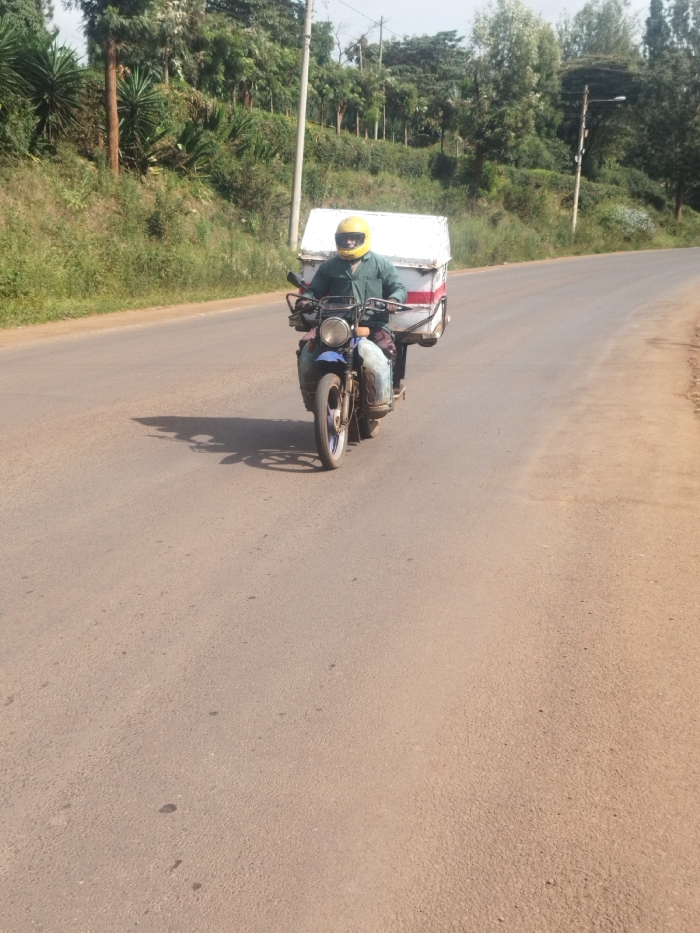 A person in a yellow helmet rides a blue motorcycle with a white box attached to the back on an asphalt road. The motorcycle is facing forward, casting a shadow to the left. Green foliage and trees line the road's edges, with utility poles visible in the background. The road surface is cracked and marked. The lighting suggests a sunny day.