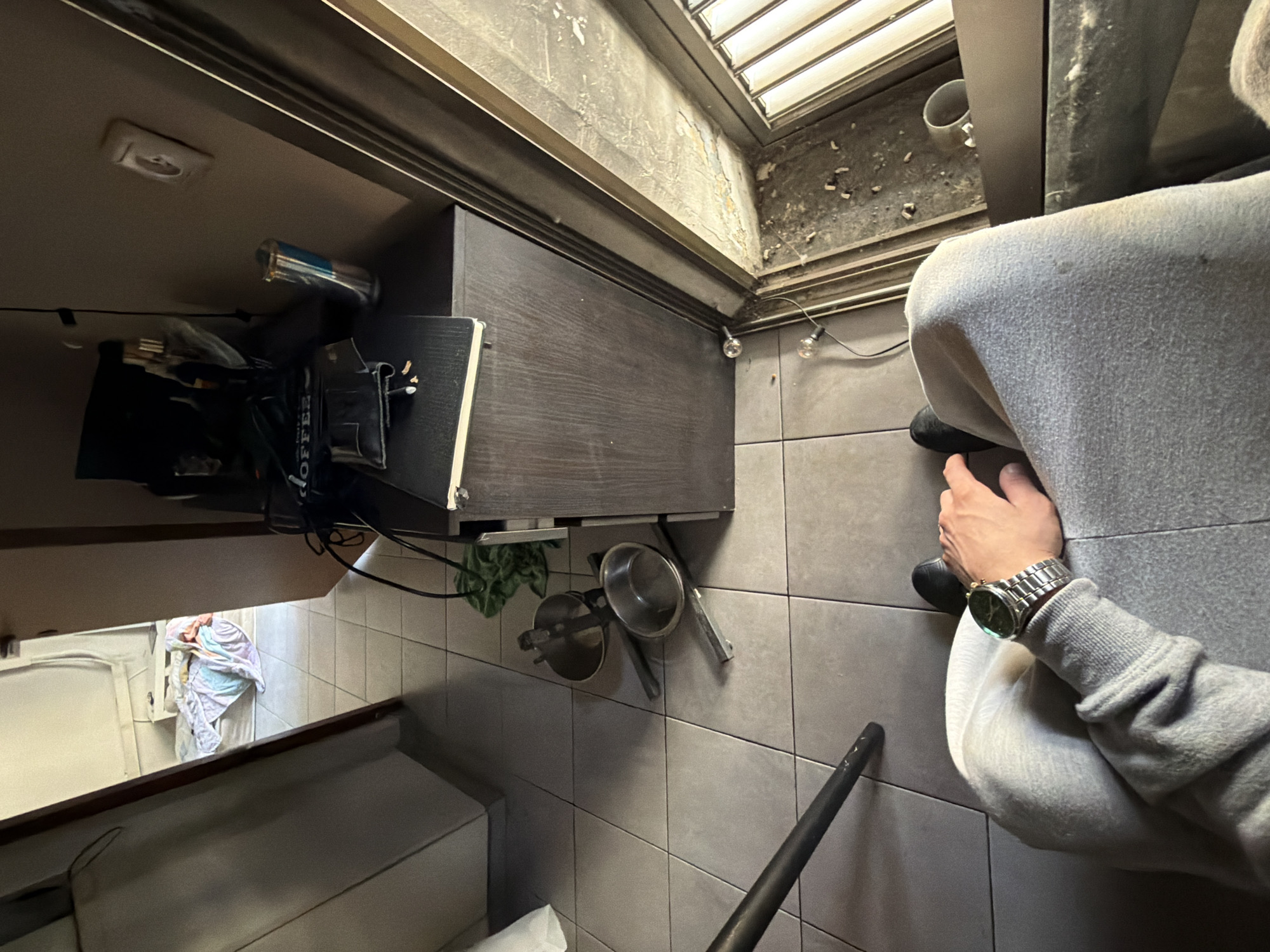 The image depicts an indoor residential scene in Haifa, Israel, viewed from a first-person perspective, looking down and forward from a seated position. In the immediate foreground, the lower torso and legs of an individual are visible, clad in light gray sweatpants. A left hand rests on the left thigh, displaying a silver-toned wristwatch with a dark green dial. Dark footwear is partially visible on the floor. To the immediate left, a dark, angled metallic leg, possibly from a tripod or furniture, extends into the frame. The floor throughout the visible area is composed of light gray square tiles. In the midground, on the tiled floor to the left, two stainless steel pots or bowls are present, one appearing overturned, alongside a crumpled green cloth. To the right of these items stands a dark brown wooden cabinet or shelving unit. Its top surface holds various items including a black notebook, a black wallet, multiple electronic cables, and a silver-colored insulated cup or thermos positioned further back. Above the cabinet, on a light-colored wall, a white electrical outlet is mounted. To the right of the cabinet, a worn metallic door or window frame is visible, showing discoloration and peeling material along its lower edge. Debris, including small fragments and several dark cylindrical objects resembling cigarette butts, is scattered on the sill or ledge just beyond the frame. Two small, bare lightbulbs connected by a wire are on the floor adjacent to this frame, and a white cylindrical object (possibly a pipe or cup) is also near the sill. Through an open doorway on the left side of the midground, a second room is visible. This room is brighter and contains a bed with light-colored bedding and multiple colorful blankets, predominantly white, light blue, and pinkish. An individual is discernible on the bed, covered by these blankets, appearing to be lying down. The room features light-colored walls and a tiled floor matching the foreground area. The overall environment suggests a lived-in interior with elements of clutter and wear.