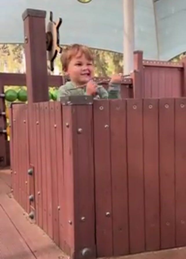 A young boy, seen from the chest up, is standing on a wooden platform enclosed by brown, bolted fencing. He is holding a small stick to his eyes as if using it as a telescope. He smiles and waves at the camera. A steering wheel is mounted on a post adjacent to the fence. Green, spherical objects are partially visible behind the fence to the left. A white, tent-like covering shields the platform from the sun. Trees are visible in the background.