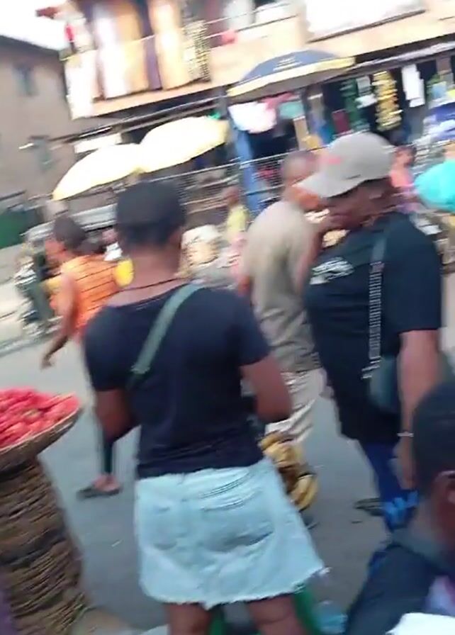 The video captures a busy street scene in what appears to be a market or commercial area. Various people are present, including vendors selling goods such as tomatoes, dried fish, and bananas. Some individuals are walking through the crowd, while others are riding in a three-wheeled vehicle called a "keke." Buildings are visible in the background, with signs and awnings lining the street. The overall atmosphere suggests a bustling and active urban environment.