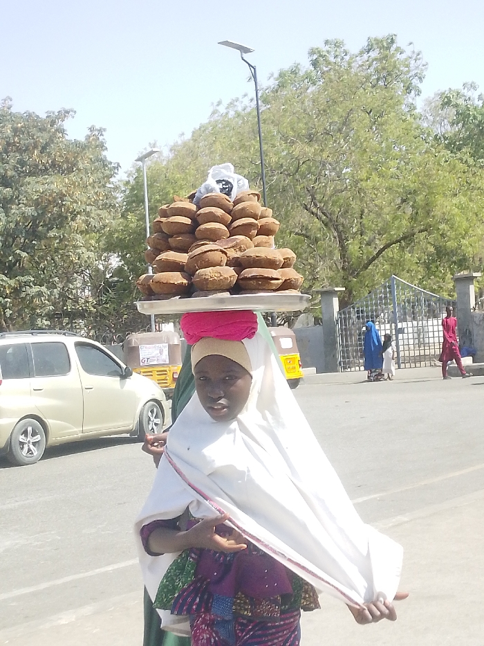 - "A young female, appearing to be of pre-teen or early teenage age, is depicted outdoors in Tarauni, Nigeria, carrying a large stack of baked goods on her head" by FM-WfIwR2, licensed under CC BY 4.0