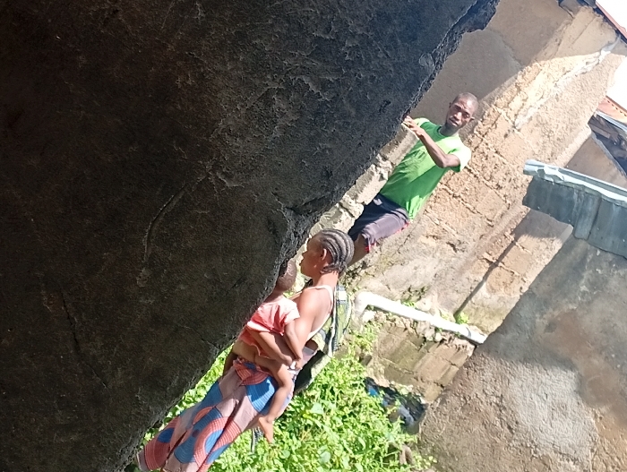 This image captures a scene in the city of Madalla, Nigeria, presented with a noticeable diagonal tilt. In the foreground, a large, dark, rough-textured surface, possibly a concrete wall or natural rock, occupies the left and bottom portions of the frame. Beyond this foreground element, two individuals are visible. A man with a shaved head is positioned on the right side of the image, appearing to be behind or above a light-brown, roughly textured concrete block wall. He wears a bright green short-sleeved t-shirt and dark shorts, with his arms bent and hands seemingly resting on the wall's edge or an unseen surface. He is looking towards the left side of the frame. Below and slightly to the left of the man, a woman is seen from the back, holding a small child. The woman has braided hair and wears a patterned wrap skirt featuring blue, pink, and orange geometric designs, along with an indistinct top. The child, dressed in a pink t-shirt, is held in the woman's left arm, facing away from the camera. The background consists of additional architectural elements, including sections of light-colored rendered walls. Green vegetation, indicative of uncontrolled growth, is visible at the base of these walls. A white PVC pipe runs horizontally along one of the walls. In the upper right corner, a section of a corrugated metal roof is present. The scene is brightly lit by natural light, casting distinct shadows.