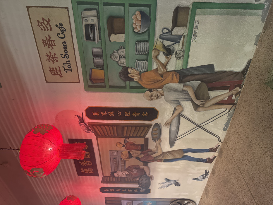 This image depicts a mural on a light-colored wall, illuminated by the red glow from two real-world, hanging red Chinese lanterns with tassels. The mural is located in George Town, Malaysia, specifically featuring a scene from "Toh Soon Cafe," a name prominently displayed on a sign at the top right in both English and Chinese characters. The mural illustrates a traditional cafe scene with multiple figures and objects. On the left, a smiling male cafe worker in a red shirt holds a tray of baked items, visible through an open, brown-shuttered window. Another worker is partially visible behind him. Below this, two grey pigeons are depicted on the mural, one in flight, one walking on the ground level. In the center, a female worker wearing a red shirt, blue jeans, and an apron extends a tray holding three small, round baked items towards an elderly, bald male customer. This customer, dressed in a light grey t-shirt and brown shorts, is seated on a red stool at a small, round, grey table with an X-shaped base. He gestures with his left hand towards the approaching tray. On the right side of the mural, a male worker in an orange t-shirt and dark apron stands behind a green counter, actively pouring liquid from a traditional coffee sock filter into a white cup. Above this counter, green shelves display various cafe items: two yellow containers, two grey mugs, a stack of white patterned cups, a white toaster oven, a loaf of bread, and a bowl of brown eggs. A stack of white plates is also visible on the counter. A pigeon is perched on a brown shutter above the central interaction. Vertical Chinese calligraphy signs are painted on the wall on the left and center. The ground in the foreground is a paved, light brown pathway.