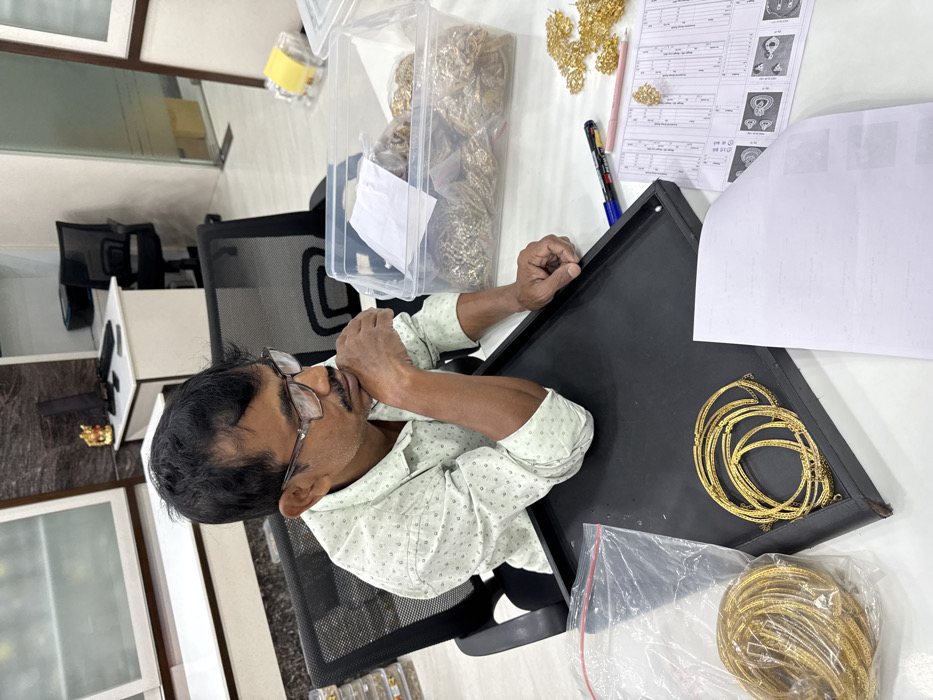 An adult male with dark hair, a mustache, and clear-framed glasses sits in a black mesh office chair at a white table in an indoor professional setting in Kolkata, India. He wears a light-colored, patterned, short-sleeved collared shirt. His right hand supports his chin in a pensive or focused posture, while his left hand rests on the table beside a black rectangular tray. On the white table surface, in the foreground, a clear plastic zip-lock bag contains multiple gold-colored, intertwined bangles or chains. Adjacent to this bag, on the black tray, several gold-colored bangles are arranged. To the right of the tray, a blue pen, a pink pencil, and a white sheet of paper displaying detailed jewelry designs (earrings, rings, pendants) with schematic information are visible. Further right, a small cluster of intricate gold-colored jewelry components is spread on the table. In the midground, a clear plastic storage container filled with multiple smaller plastic bags, each containing numerous gold-colored jewelry items, is present. The background reveals a modern office environment with light-colored walls and flooring. A white desk with a computer monitor and a black office chair is behind the man. A glass partition separates this area from another office space where a dark desk, another chair, and a small golden Ganesha idol are visible.