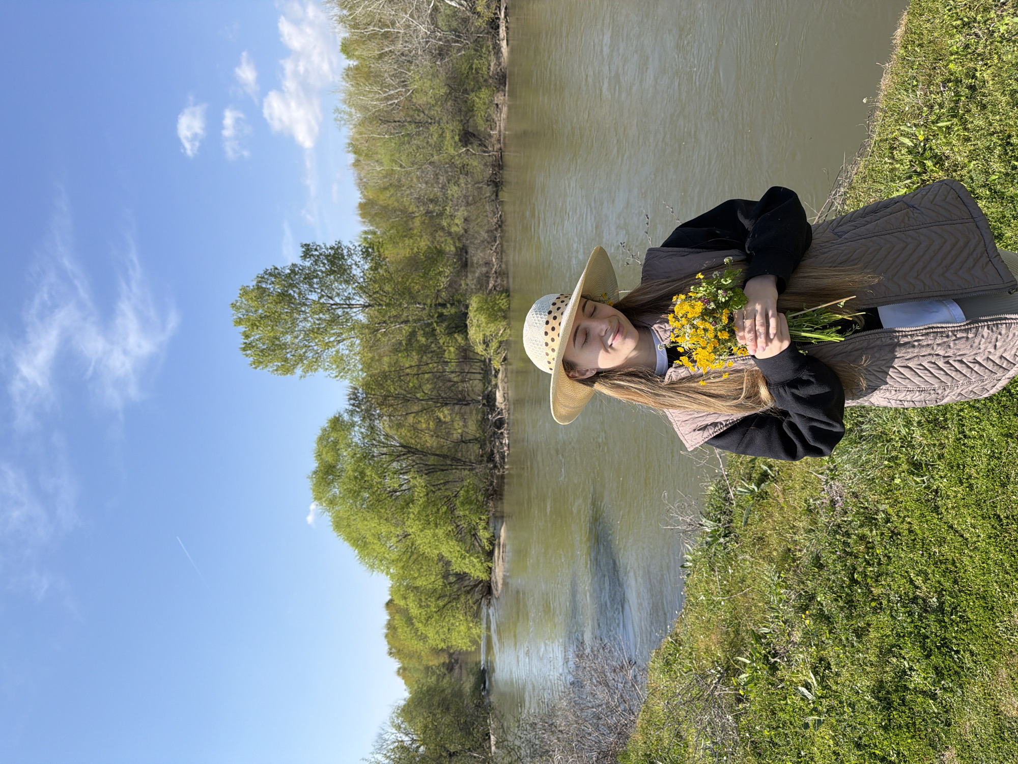 A young woman with long brown hair is lying on a grassy bank next to a river or stream. She is wearing a wide-brimmed straw hat with polka dot cut-outs, a black long-sleeved shirt, and a quilted brown vest. Her eyes are closed, and she is holding a bouquet of yellow wildflowers. The river is calm and reflects the surrounding trees, which are a mix of bare branches and fresh green leaves. The sky is blue with scattered white clouds. The location is not evident in this image.