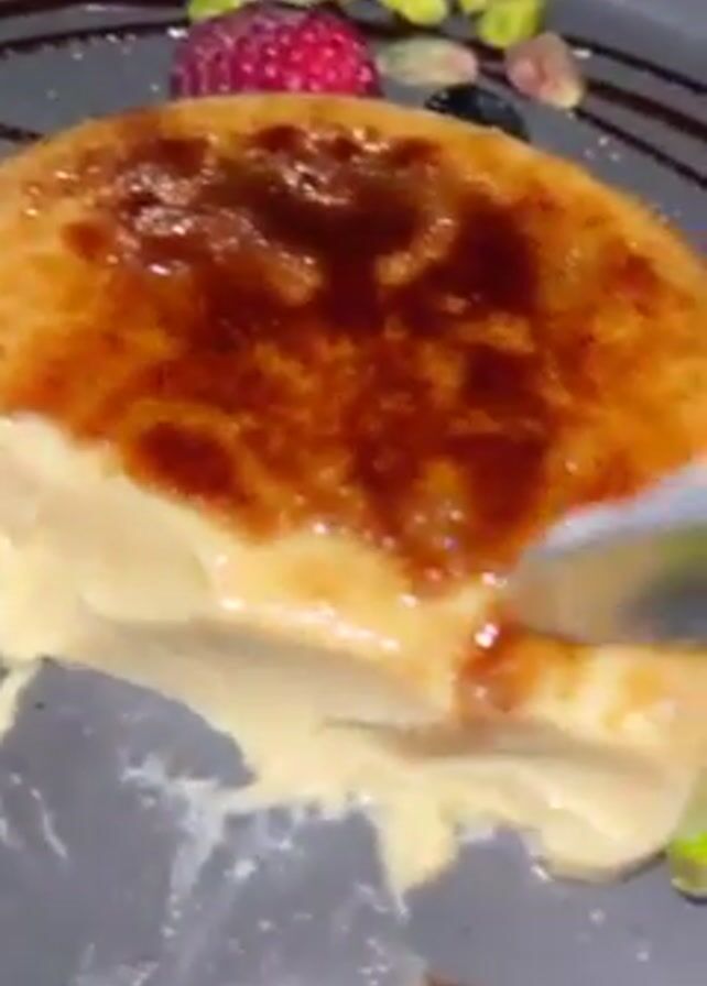 A close-up shows a plate of creme brulee with berries and pistachios. A spoon scoops a portion of the dessert. The person holding the spoon wears a white sleeve.