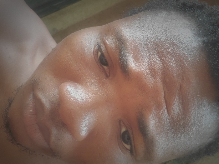 A close-up, slightly tilted portrait captures a man with dark skin. His face is the main subject, featuring a prominent nose and visible fine lines on his forehead. His gaze is directed off-camera, revealing dark irises. A small portion of his shoulder is visible on the left, suggesting he's shirtless. His hair is dark and closely cropped. The lighting highlights the texture and tone of his skin, creating a slightly glossy appearance.