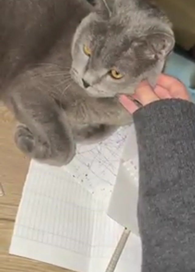 A person wearing a gray sweater gently strokes the cheek of a gray cat. The cat is lying down on top of a piece of paper covered in blue lines, along with a pencil. The surface beneath the paper appears to be wooden.