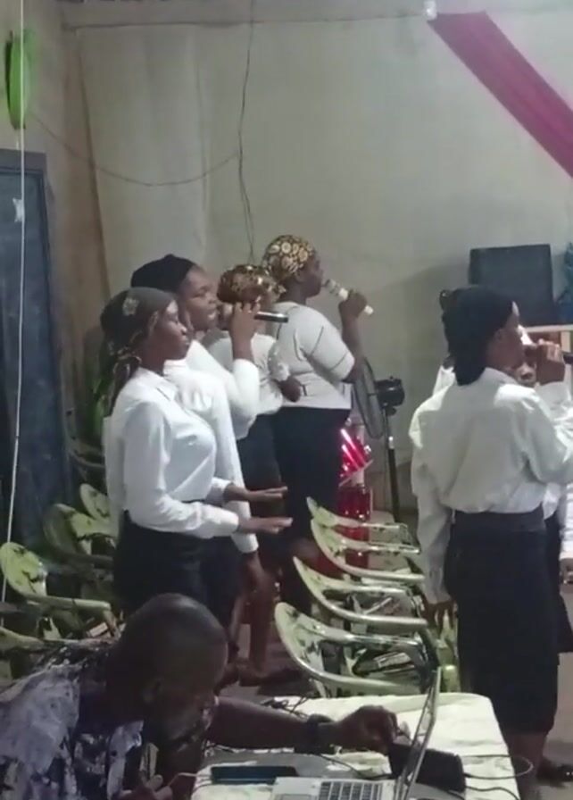 A group of about seven women, dressed in white shirts and black skirts, are standing together and singing into microphones in an indoor setting. One woman has a patterned head covering. Behind them, a row of chairs is visible, with a red drum set partially visible behind the center singer. In the foreground, a man sits at a table, working on a laptop. The room appears to be a simple, possibly church-related, space with a plain wall and a red cloth decoration hanging in the background. The lighting is provided by a single bright ceiling lamp.