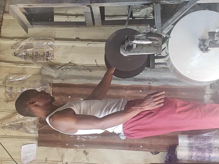 The scene depicts an interior view within what appears to be a workshop or production facility in the city of Iddah, Nigeria. An adult male, with dark skin and short dark hair, stands in profile facing right. He is wearing a white sleeveless undershirt and maroon-colored athletic trousers with a white drawstring visible at the waist. His right hand is extended towards and interacting with a large, industrial machine. This machine features an upper dark-colored circular disc or wheel and a prominent lower white cylindrical roll, possibly paper or fabric, which appears to be in motion or recently unwound. Mechanical components, including gears and metal framing, are visible on the machine. The background consists of corrugated metal wall panels, some exhibiting rust. Several transparent plastic bags, some containing items and bearing text such as "BIPAT" and "AMSA," are affixed to the wall. A white paper note is visible on the upper left wall. Stacks of clear plastic cups or containers are present on the floor in the lower left portion of the image.