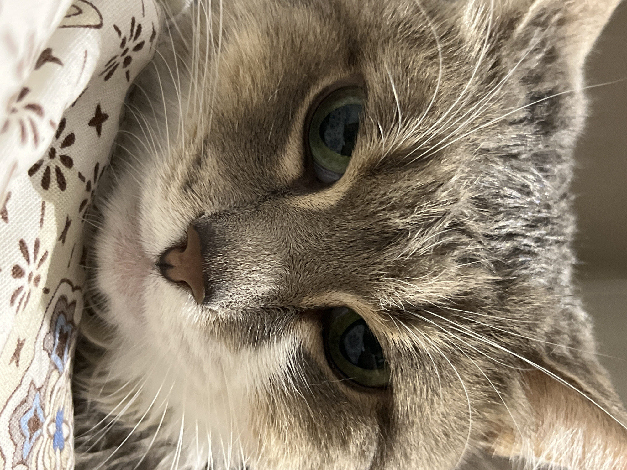 A close-up, slightly rotated image shows a gray tabby cat's face. The cat's eyes are green. A white and brown patterned fabric is visible on the left side of the image. The location is not discernible from the image.