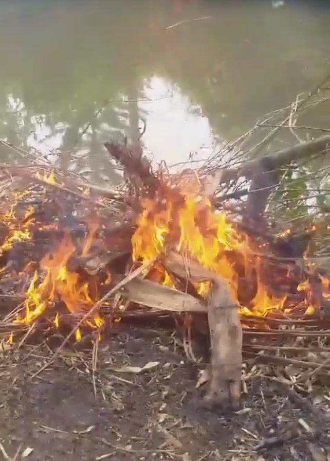 A small fire burns on the ground near a body of water. The fire is consuming twigs, branches, and other plant debris. The ground is dark and covered with ash and leaves. The water behind the fire reflects the sunlight. A few thin branches protrude from the far side of the fire. Trees line the bank on the opposite side of the water.