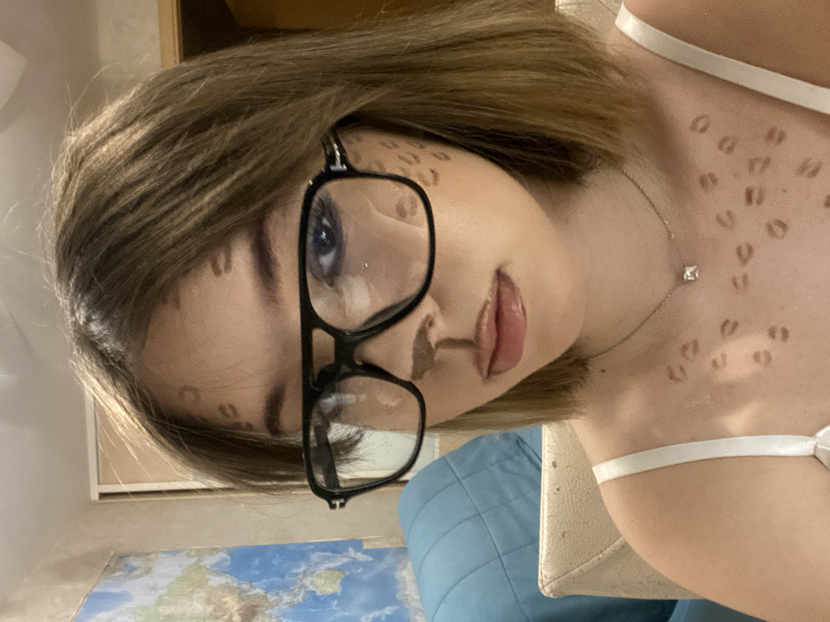 This image depicts a young female subject positioned indoors, located in Chaikovsky, Russia. The individual has short, light brown hair and is wearing dark-framed aviator-style eyeglasses. Her face and upper chest are adorned with makeup, including a brown-painted nose with a vertical line extending to the upper lip, simulating an animal snout. Numerous small, brown, U-shaped or crescent-shaped spots are applied to her forehead, cheeks, and décolletage, resembling leopard or cheetah print. Dark eyeliner is visible on her right eye (viewer's left). She wears a light-colored, thin-strapped top and a silver-colored chain necklace featuring a small, square, clear stone pendant. The background reveals a light blue quilted pillow on a light-colored chair to the left, a world map on a wall behind it, and a dark brown doorframe or furniture edge on the right. The subject is facing directly towards the camera, suggesting a self-portrait.