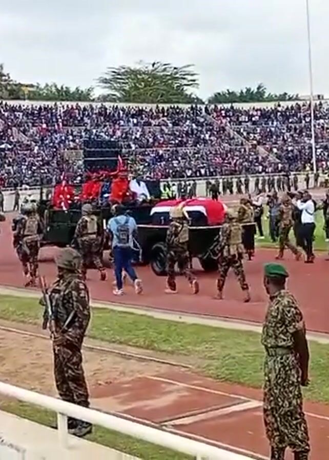 large crowd gathered in a stadium. Soldiers in camouflage uniforms are lined up along the track. A military jeep, carrying what appears to be coffins covered with flags and red cloth, is moving along the track. The jeep is surrounded by more soldiers and a few civilians. Police motorcycles are visible in the background. A white bus is parked on the side. The scene appears to be a military funeral procession taking place in a stadium.