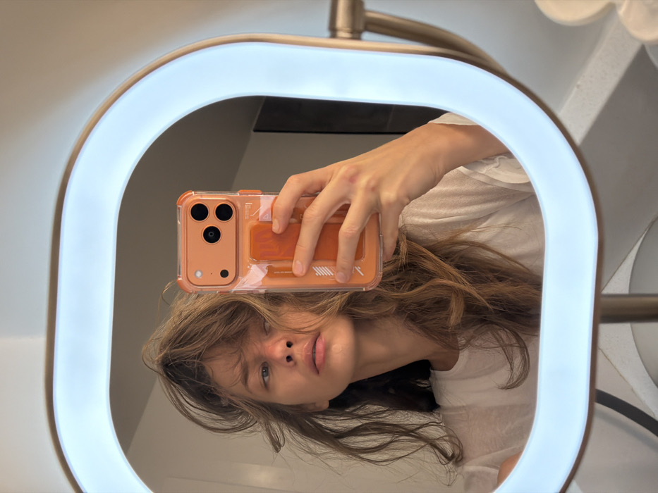 A woman angles her face toward the camera, capturing a selfie in a mirror. Her light brown hair frames her face, and she wears a white top. She holds a coral-colored iPhone with a clear, patterned case, partially obscuring her face. The mirror has a rounded square shape and is illuminated by a soft, bright light around the perimeter. A metallic fixture is visible above the mirror. A modern, minimalist aesthetic is evident in the background.