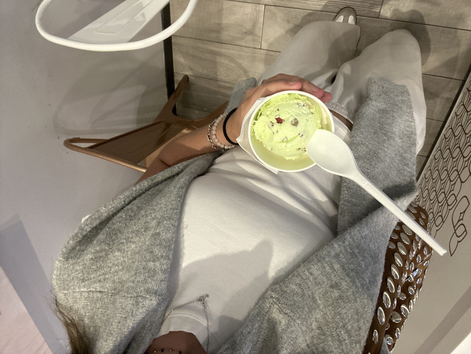 - "An overhead, angled shot depicts an individual seated indoors, holding a white paper cup of light green ice cream containing red and brown inclusions" by FM-YBWU82, licensed under CC BY 4.0