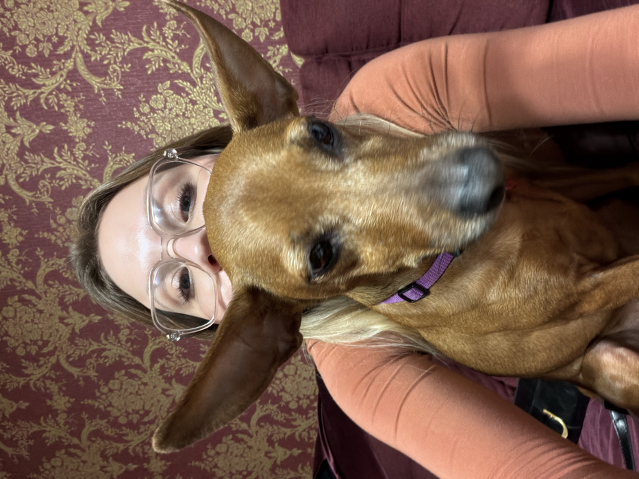 A person with glasses and long blonde hair is lying on a couch. They are positioned closely next to a brown dachshund dog wearing a purple collar. The dog's head is near the person's face. The background features a patterned wall and the couch the people are lying on. The person is wearing an orange shirt.