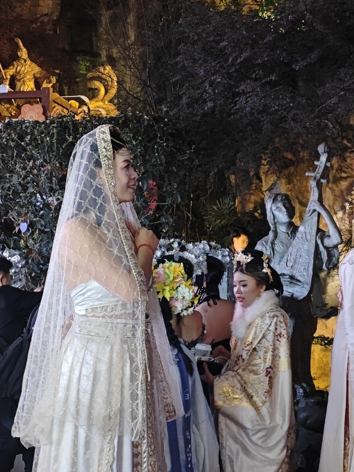 The image depicts an outdoor, artificially lit scene at night in Yuzhong District, China, featuring individuals in elaborate attire within a landscaped environment
