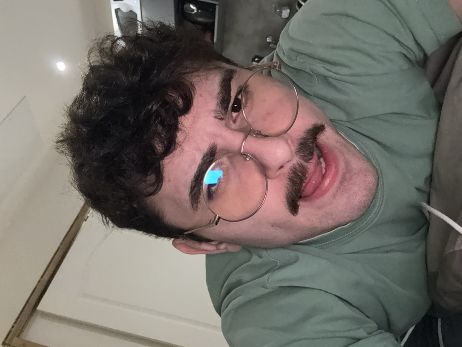 A person with curly dark hair, wearing round glasses, and a thick mustache looks into the camera. Their tongue is sticking out, and they seem to be on a bed or couch, wearing a green t-shirt. The image is rotated to the side, showing a portion of a white wall and some objects in the blurred background. The lighting is soft and diffused.