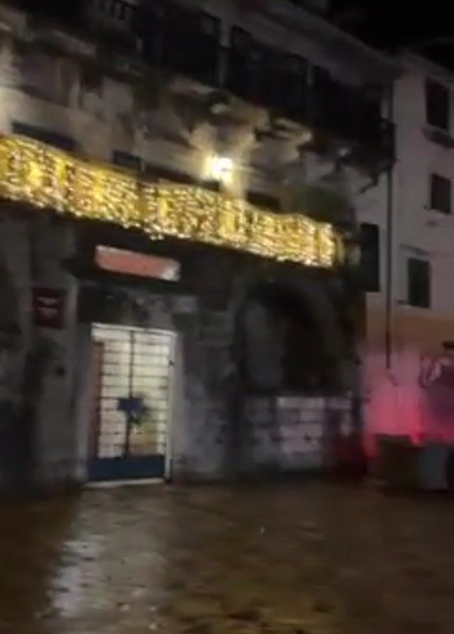 nighttime scene in a European town square. The square is surrounded by old stone buildings, lit by yellow street lights and Christmas lights. The ground is wet, reflecting the lights. In the center of the square, there are cafe tables and chairs, illuminated by red and blue lights. A person in a floral shirt walks past the camera.