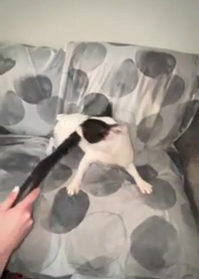 A woman is using a vacuum attachment on a black-and-white dog lying on a gray and white patterned sofa. The dog is moving around as she touches it with the vacuum. The room has a white wall.