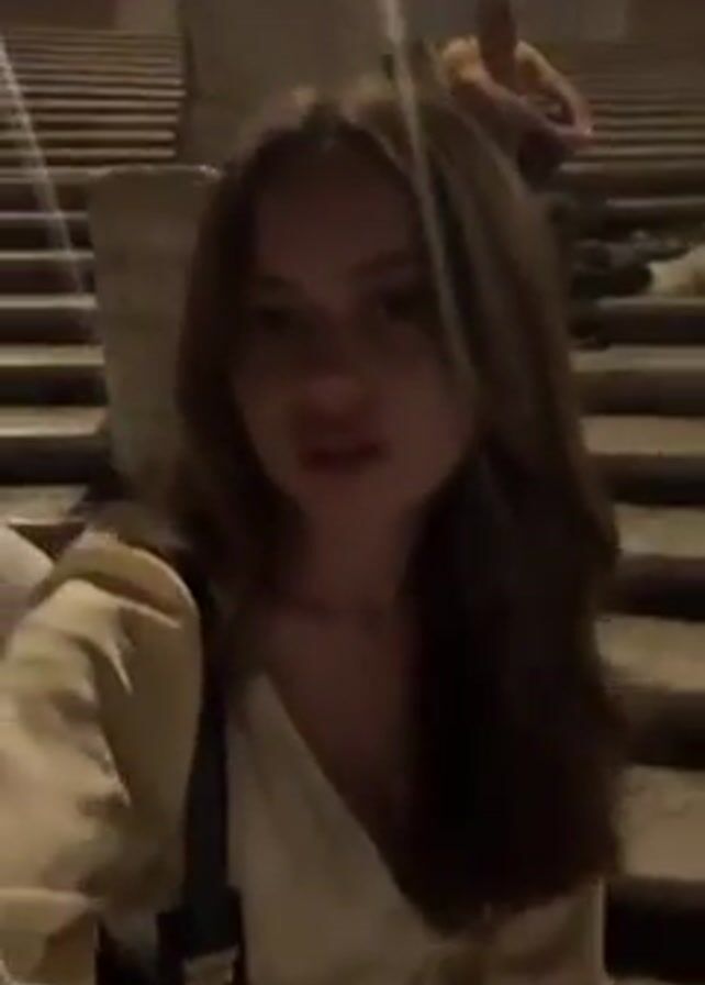 A young woman holds a camera, recording a video of herself as she stands in front of the Spanish Steps in Rome at night