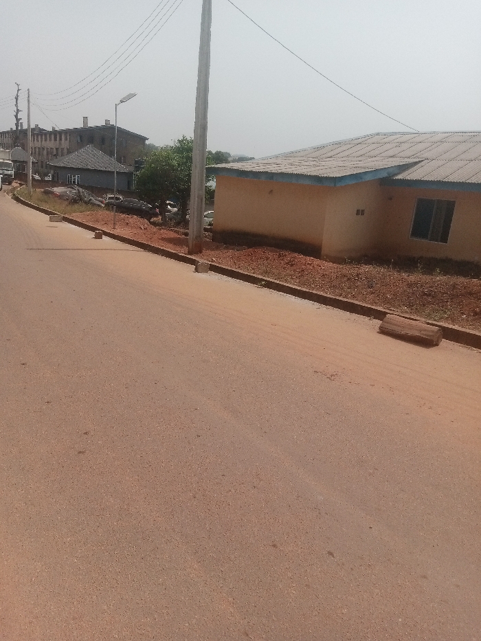 The image depicts a static street scene in Links Reservation, Nigeria, under a hazy sky. A paved, reddish-brown asphalt road occupies the foreground and mid-ground, curving slightly to the left into the distance. On the right side of the road, a concrete curb separates the pavement from a strip of reddish-brown soil, where a cut wooden log lies horizontally in the foreground. Several small, light-colored concrete blocks are spaced along the curb further down. To the right, a single-story building with light tan walls and a corrugated metal roof featuring a light blue trim is partially visible. Reddish-brown earth is piled against its base. A dark-paned window is visible on its side. A tall utility pole with multiple overhead power lines stands prominently on the right side of the road, extending towards the background. On the left side of the road, further down, a thinner pole with a street lamp fixture is visible. Behind it, a patch of green foliage partially obscures the background. In the far background, on the left, several multi-story buildings with dark, weathered facades are discernible, along with a smaller, dark-roofed single-story structure. A cluster of indistinct vehicles appears to be parked or located near these background buildings. No individuals are visible.
