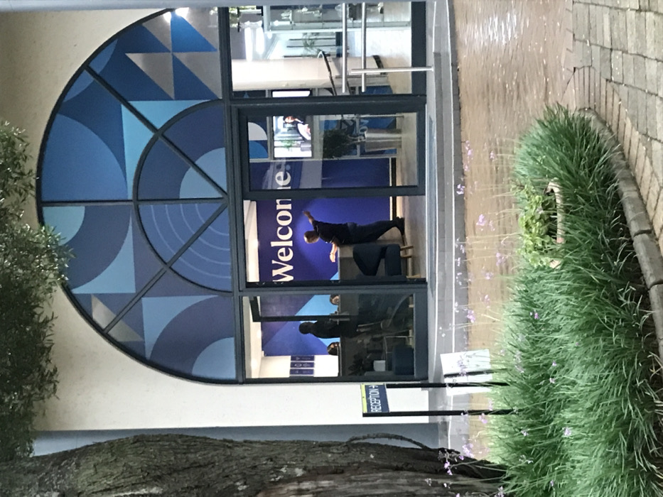 An external view of a building entrance in Midrand, South Africa, is depicted. The primary feature is a large, arch-shaped glass facade above the main entryway, segmented by dark frames and featuring geometric patterns in various shades of blue, white, and light grey. Below this, two glass doors lead into the building, with the left door slightly ajar. Inside the building, a reception area is visible. A prominent blue wall behind the reception desk displays a large white "Welcome" sign. One individual, a light-skinned male wearing a dark top and trousers, stands in front of the reception desk, with his right arm extended slightly. A second individual, seen in silhouette, stands further left behind the open door near the reception desk. Reflections on the glass reveal internal office elements, including a television screen displaying a person, a potted plant, and metallic railings. To the left of the building entrance, part of a large tree trunk and some foliage are visible. In the immediate foreground, a manicured garden bed contains long, green, grass-like plants and scattered delicate purple flowers on thin stalks, along with a small potted plant. A black signpost within this garden bed points right with "RECEPTION ->" printed in white. The area directly in front of the building is a brick-patterned paved surface, appearing wet, with three steps leading up to the entrance doors.