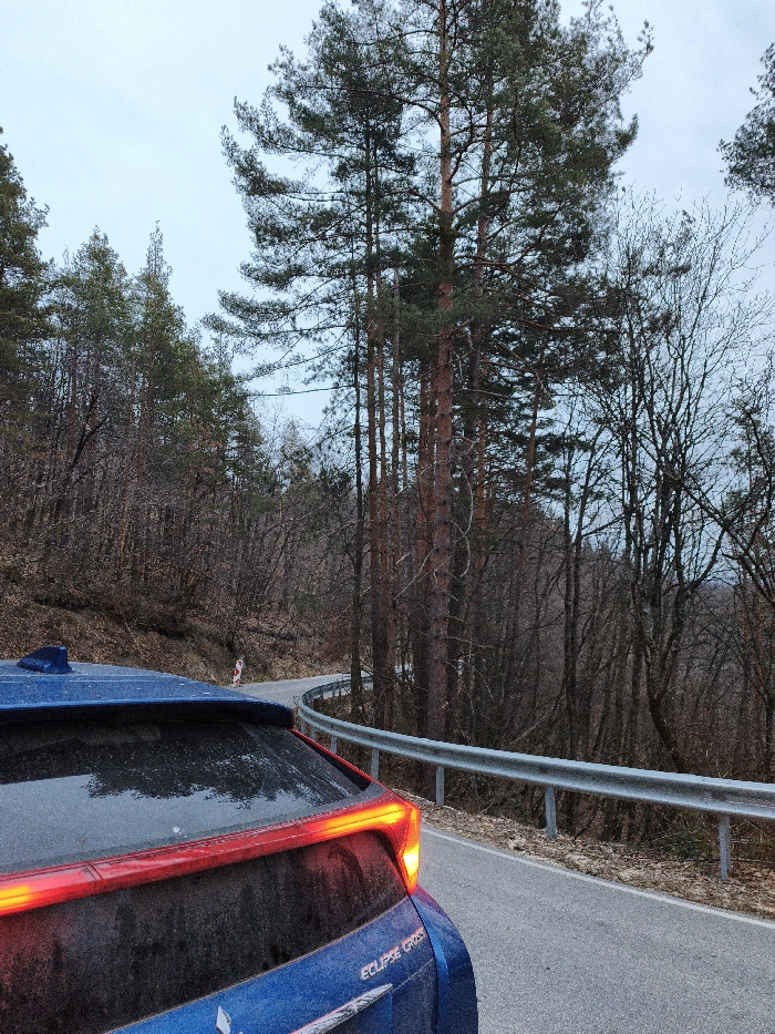 A blue Mitsubishi Eclipse Cross SUV, viewed from the rear-driver's side, is stationary on the right shoulder of a paved asphalt road. The vehicle's rear window is soiled, and its red taillights, including a prominent horizontal light bar, are illuminated. A shark fin antenna is visible on the roof. The road ahead curves sharply to the left, marked by a silver metal guardrail following its contour on the right. A white and red chevron sign is visible on the wooded slope to the left of the road, indicating the sharp turn. The environment consists of a dense forest with a mix of tall coniferous trees with green needles and reddish-brown trunks, and numerous bare deciduous trees, suggesting late autumn or winter conditions. The sky is overcast and light grey. No individuals are present. The scene is located in the city of Sveti Konstantin, Bulgaria.