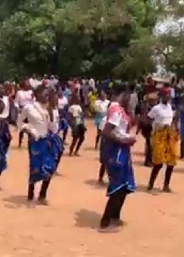 A group of people are dancing in a dirt courtyard, surrounded by a crowd. The dancers consist of both men and women; they are wearing a variety of colorful outfits. Some are wearing white shirts with colorful patterned skirts or shorts, while others are in patterned robes. Behind the dancers, a large crowd is watching, partially obscured by the trees in the background. A table with a white cloth and what appears to be blue containers sits on the right side of the frame. The setting appears to be an outdoor event or celebration.