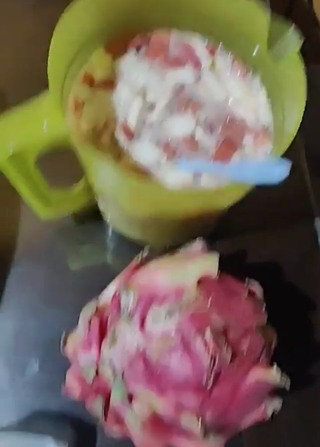 On a metallic surface, there is a yellow pitcher filled with a mixture of chopped fruits in a liquid. There appears to be watermelon, white translucent pieces, and some dark seeds in the mix. A blue plastic spoon rests inside the pitcher. Next to the pitcher lies a whole dragon fruit with a pink rind. The camera slightly adjusts its angle and zooms in a bit. In the background, there's a small, empty glass.