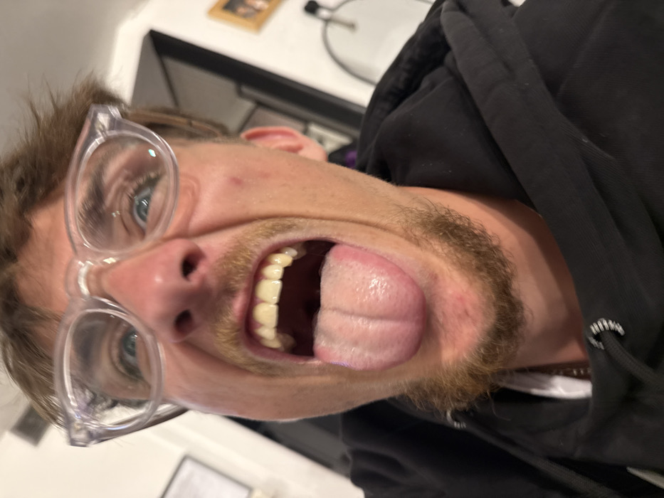 A man with light skin, blue eyes, and a beard and mustache wears clear-framed glasses. His mouth is wide open, revealing teeth and a tongue. He's wearing a black hooded sweatshirt. The background is blurry, but it appears to be a room with a picture frame on a wall and a metal object. The image is tilted to the side.
