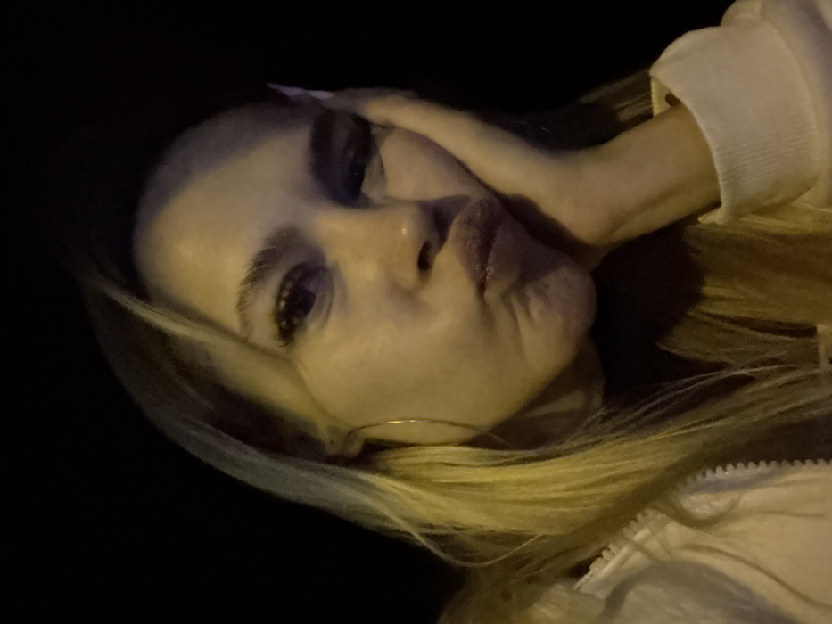 A low-angle, dimly lit selfie features a blonde woman with fair skin