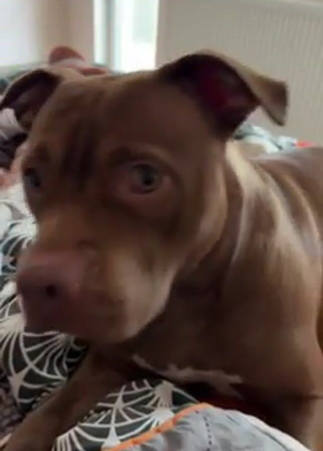 A close-up video shows a brown pitbull-type dog on a bed with patterned gray and white bedding