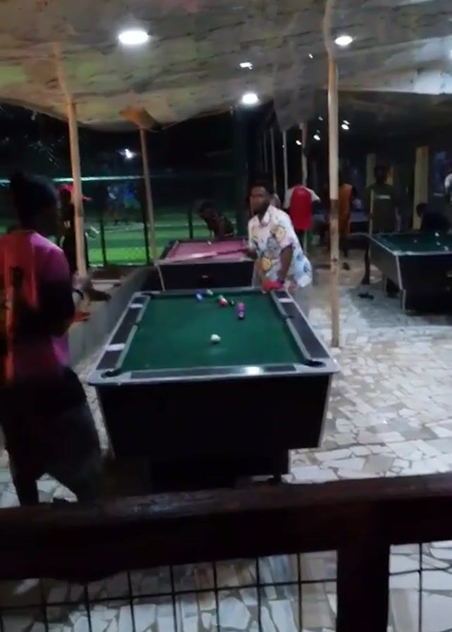 n outdoor billiard hall with multiple pool tables. Several men are playing pool. The space is covered by a makeshift roof, supported by wooden poles. There are people standing around the tables, watching the games. The floor is paved with an intricate pattern of light-colored tiles. A chain-link fence partially obscures the view from the foreground. Beyond the pool area, there is a grassy area, and more people can be seen in the distance. The lighting suggests it is evening.