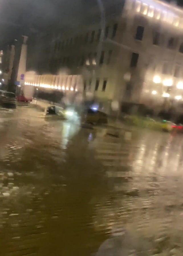 The video depicts a rain-soaked city street at night, viewed from inside a vehicle. The camera is shaky, and the view is somewhat obscured by raindrops on the window. In the background, there is a large building illuminated by a series of lights, reflecting in the flooded street. Two taxis are parked along the street, their taillights reflecting in the water. The street itself is covered in a sheen of water, with reflections of streetlights and building lights visible. The overall impression is of a dark, wet, urban environment.