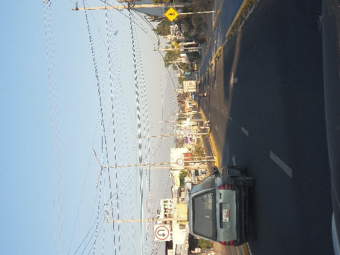 The image depicts a forward-facing daytime street scene in San Andrés Cholula, Mexico, under a clear, light blue sky