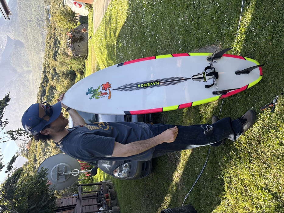 A man in a blue cap, gray t-shirt, and jeans stands outside holding a white surfboard with neon pink and yellow accents. The surfboard features a "Local Motion" logo with a palm tree and the word "HAVENGA" in bold letters. Three fins are attached to the tail of the board. A car is partially visible behind the man. The setting includes green grass, trees, mountains in the background, and a satellite dish. The photo is taken in natural daylight.