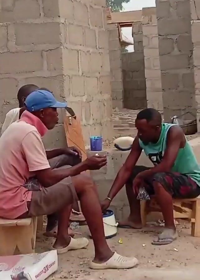 Three men are seated on small wooden stools at a construction site. The man on the left wears a pink shirt, brown shorts, a blue baseball cap, and cream-colored slide sandals. He holds a blue mug. Another man sits to his left, mostly obscured. The man on the right wears a green tank top and patterned shorts, and he's also wearing slide sandals. He reaches out to touch the wrist of the man with the pink shirt. A white bucket and a torn bag of "DANGOTE CEMENT" are on the ground. The construction site has walls made of concrete blocks.