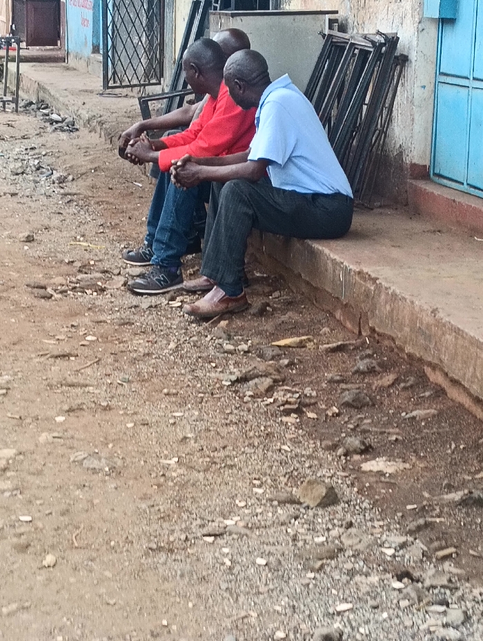 In Thika, Kenya, three adult males are seated on a concrete ledge along an unpaved street