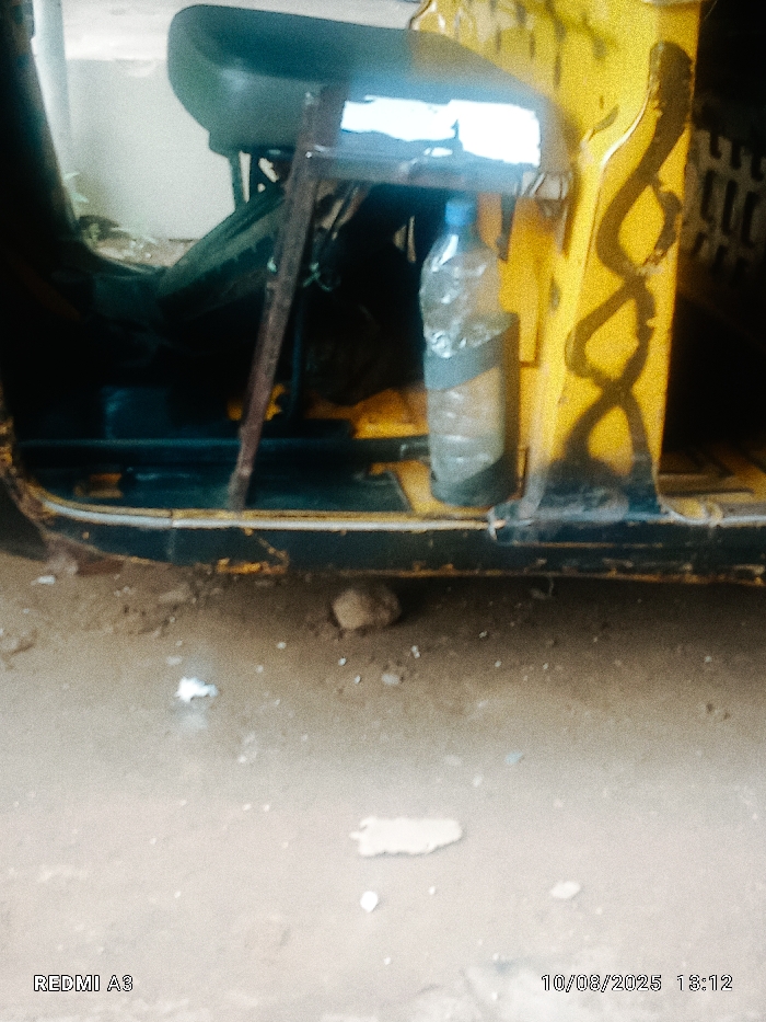 The image depicts the lower section of a yellow and black three-wheeled vehicle, commonly referred to as a Keke Napep or tricycle, parked on an unpaved surface in Obosi, Nigeria. The vehicle's exterior features a prominent yellow side panel with black, abstract, possibly serpentine, markings. Attached to this panel with grey tape is a clear plastic bottle containing a light-colored sediment or liquid. A dark, possibly green or black, seat is partially visible within the vehicle's interior in the upper left. The lower frame of the vehicle is dark, showing signs of wear, including scratches and areas of exposed rust. The ground beneath the vehicle is a light brown, packed dirt or sandy surface. A single, small, rounded rock is positioned near the vehicle's base, along with several scattered small, irregular white fragments and a larger, flat, light-colored piece of debris on the ground. The background behind the vehicle is indistinct, appearing as a blurred, light-colored structure with shadowed areas. No people are visible. The image was recorded by a REDMI A3 device on October 8, 2025, at 13:12.