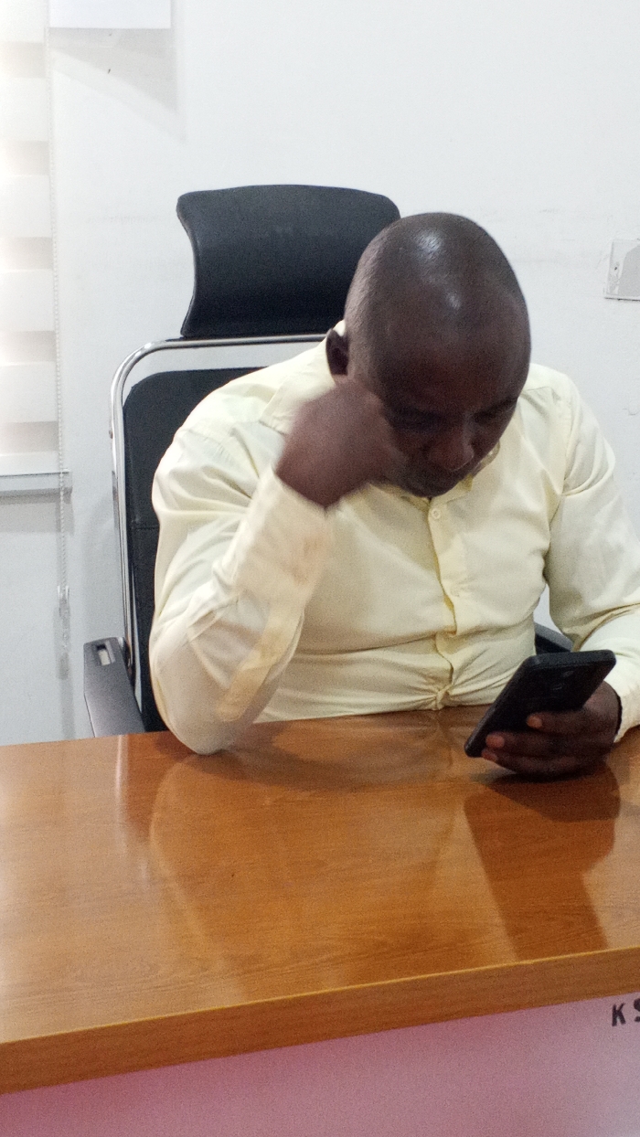 An adult male with dark skin and a bald head is seated at a polished light brown wooden desk, engaged with a black smartphone held in his left hand. He wears a light yellow long-sleeved button-up shirt. His right elbow rests on the desk, with his right hand supporting his chin. A black office chair with a metallic frame is partially visible behind him. The background features a white wall with white vertical blinds visible on the left side. Beneath the desk, a light pink or purple surface is visible, bearing faint dark lettering "KS" on the lower right. The scene is located in Lokoja, Nigeria.